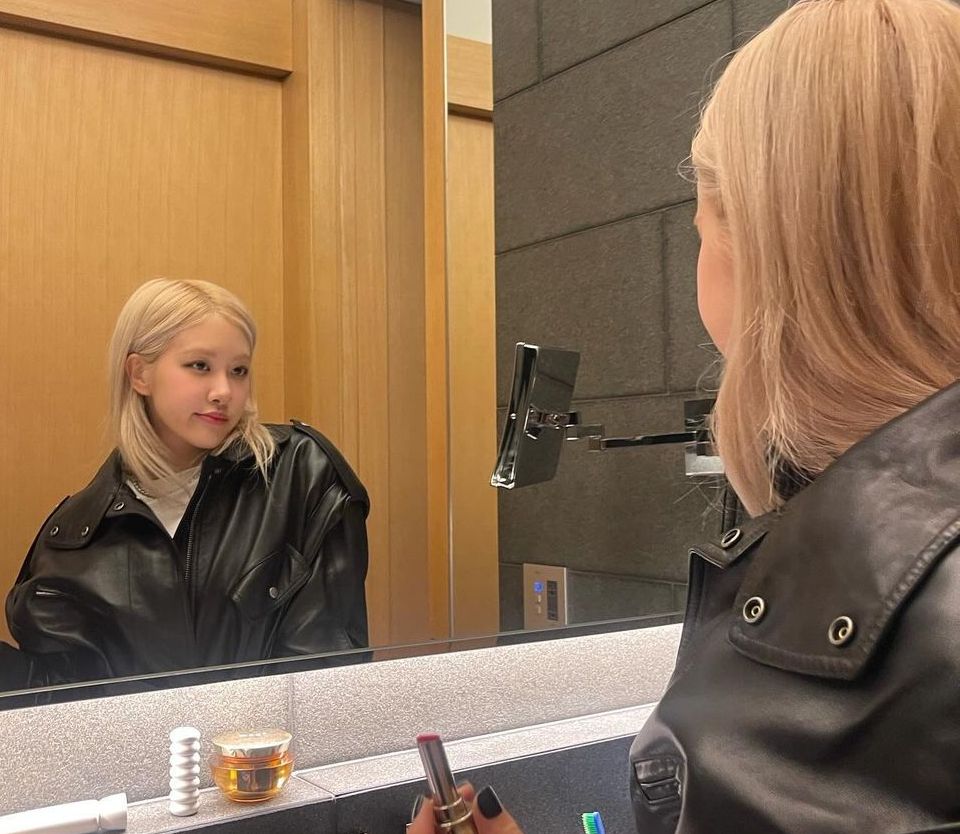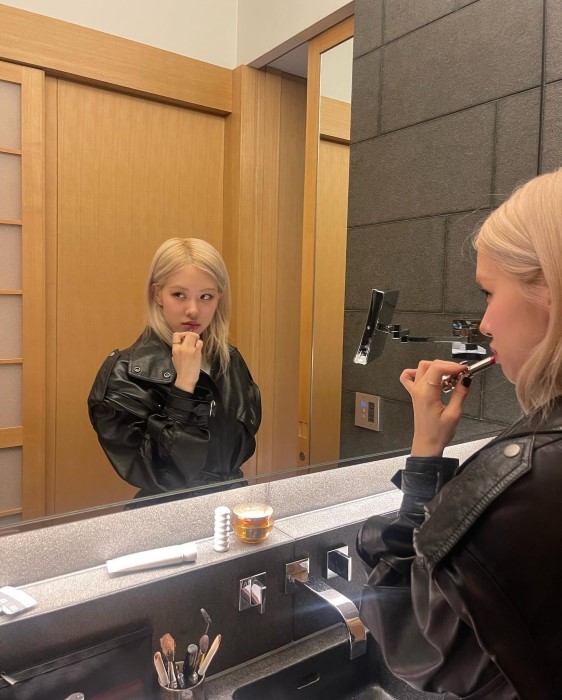 Sembari menggunakan Lipstik, Rose memamerkan rambut baru dengan wajah innocent yang menggemaskan, mengenakan leather jacket dress, Rose BLACKPINK tampil bergaya edgy dengan ankle soak dan loafers.
