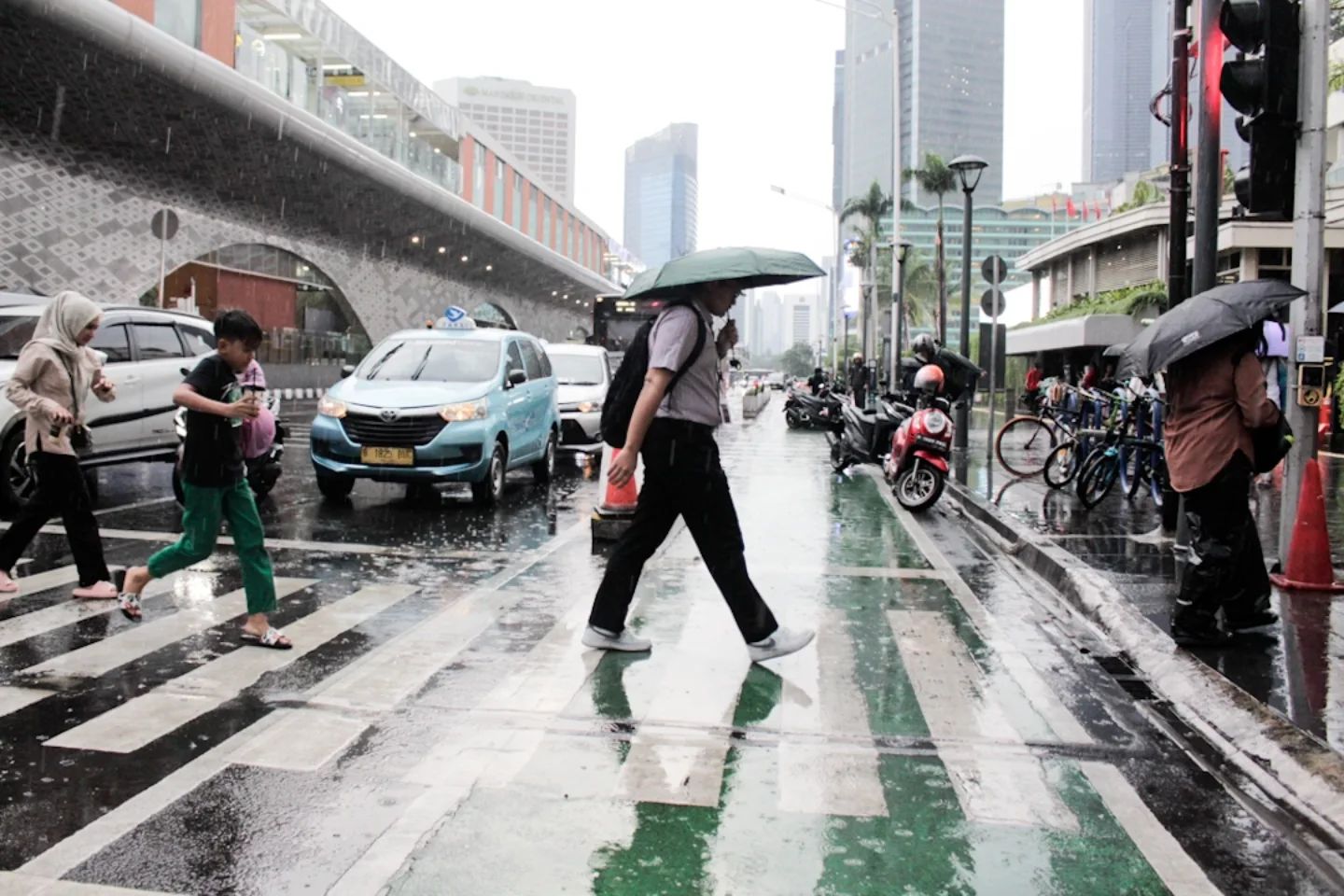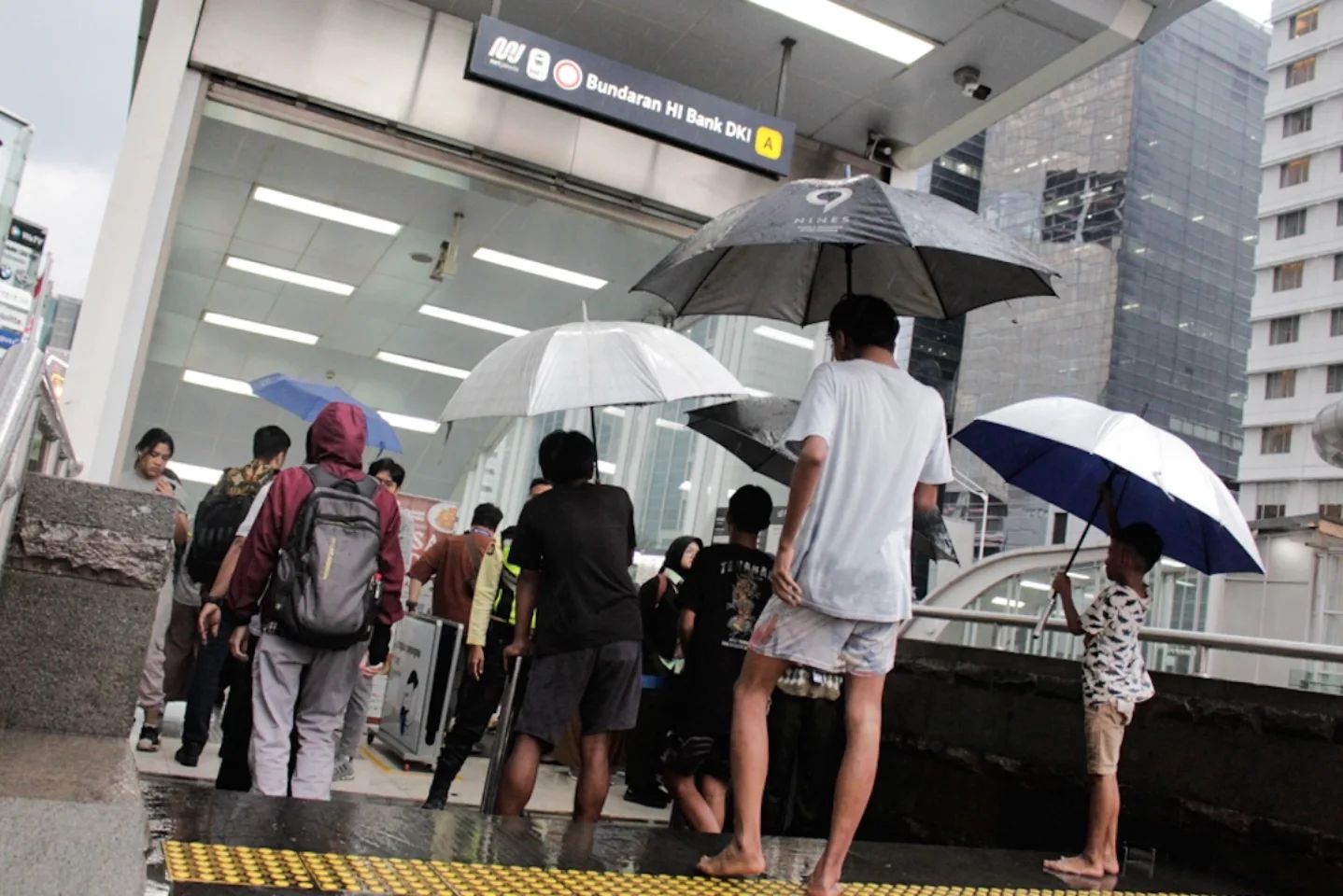 Seketika.com, Jakarta – Sejumlah ojek payung menawarkan jasa penyewaan payung bagi pejalan kaki di kawasan Stasiun MRT Bundaran HI, Jakarta, Selasa (5/11/2024). Masuknya musim hujan pada bulan November dimanfaatkan sejumlah warga untuk mengais rezeki dengan membuka jasa sewa payung. (Foto: Seketika.com)