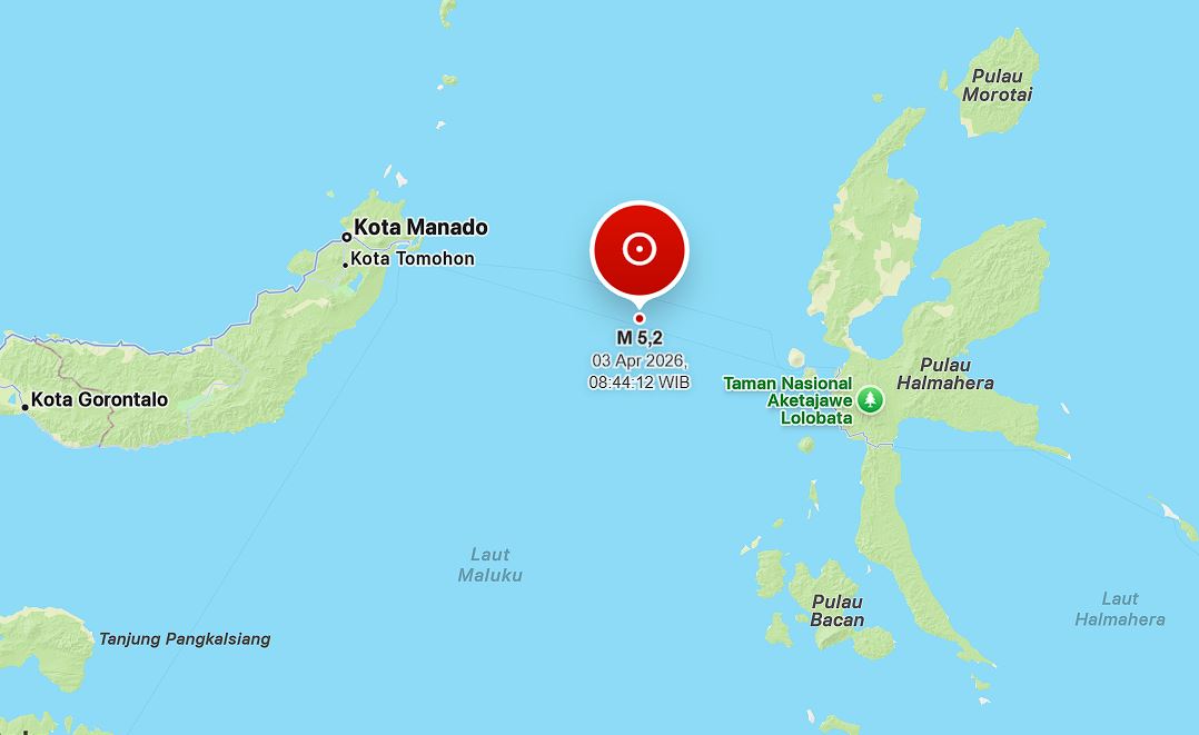 Seketika.com, Jakarta – Gempa bumi berkekuatan 5,2 Skala Richter mengguncang perairan 102 km Barat Laut Ternate, pada 03 April 2026 pukul 08:44 WIB, menurut data resmi dari BMKG. Gempa ini tercatat memiliki kedalaman 10 km dengan koordinat 1,00 LU – 126,47 BT.