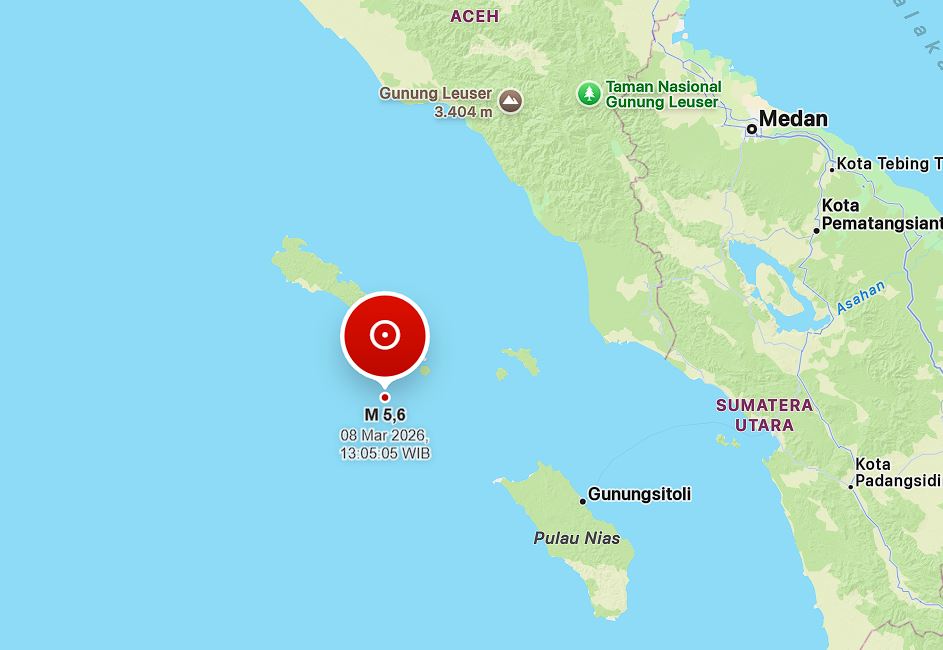 Seketika.com, Jakarta – Gempa bumi berkekuatan magnitudo 5,6 mengguncang wilayah 63 kilometer tenggara Sinabang, Aceh, pada Minggu (8/3/2026) pukul 13.05 WIB.