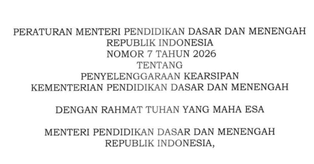 Seketika.com, Jakarta – Kementerian Pendidikan Dasar dan Menengah (Kemendikdasmen) resmi menetapkan Peraturan Menteri Pendidikan Dasar dan Menengah Nomor 7 Tahun 2026 tentang Penyelenggaraan Kearsipan. Regulasi ini menjadi dasar hukum dalam memperkuat tata kelola arsip yang komprehensif, terpadu, akuntabel, efektif, dan efisien di lingkungan kementerian.