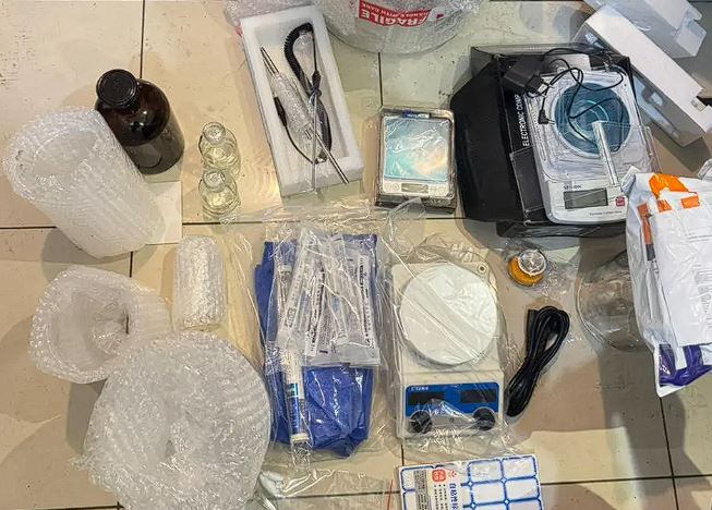 Barang bukti yang diamankan meliputi tabung laboratorium, alat suntik, timbangan digital, alat aduk kaca, bahan kimia, serta berbagai perlengkapan pendukung produksi lainnya.