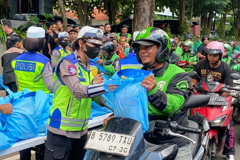 Polda Metro Jaya menggelar kegiatan sosial dengan membagikan ratusan paket sembako kepada para pengemudi ojek online. Aksi ini berlangsung di depan Gedung Promoter pada Jumat, 24 April 2026.