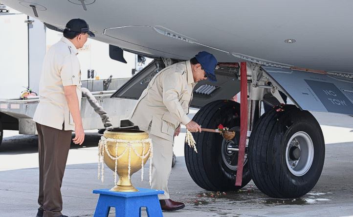 Rangkaian prosesi penyerahan kemudian dilanjutkan dengan penyerahan kunci pesawat secara simbolis oleh Presiden Prabowo kepada Panglima TNI Jenderal Agus Subiyanto.