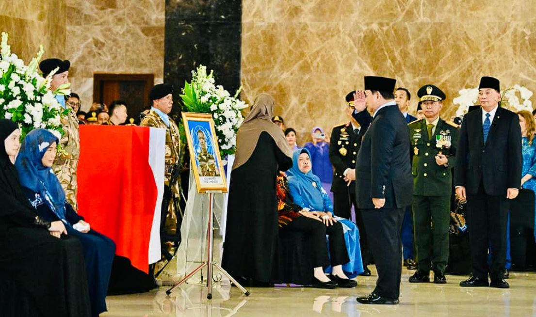 Prosesi penghormatan oleh Presiden berlangsung khidmat dengan diiringi doa bagi para prajurit yang gugur dalam tugas mulia menjaga perdamaian dunia.