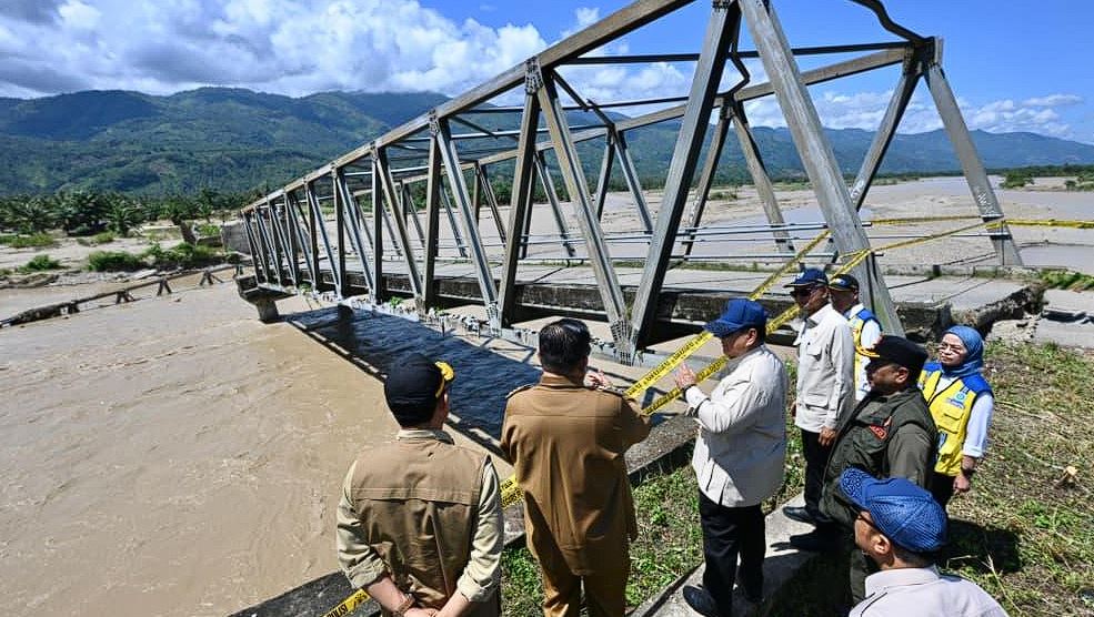Presiden Prabowo terlihat berjalan menyusuri tepian jembatan yang rusak, memperhatikan langsung sisa-sisa konstruksi yang roboh.