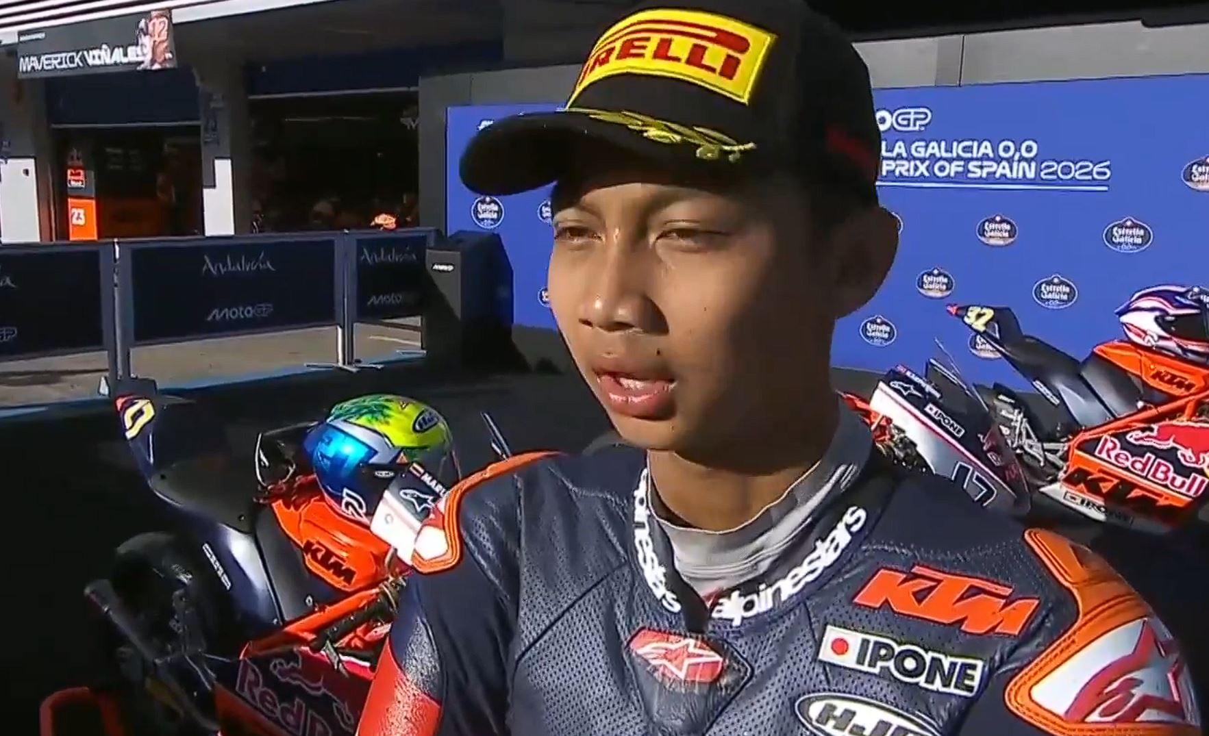 Ramadhipa tampil mengejutkan pada balapan kedua Rookies Cup di Jerez, Minggu (26/4/2026). Start dari barisan belakang, ia mampu menyalip satu per satu pembalap hingga finis di posisi pertama.